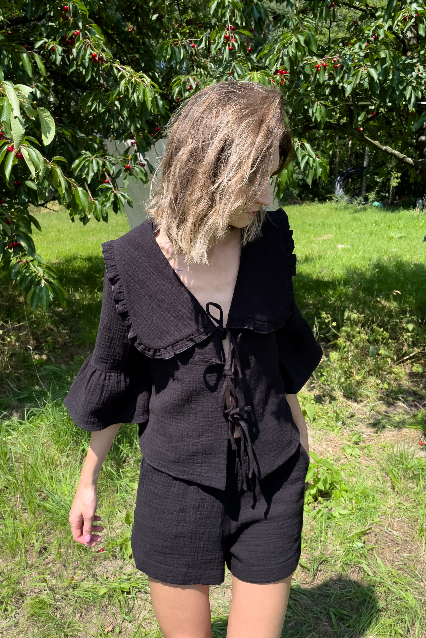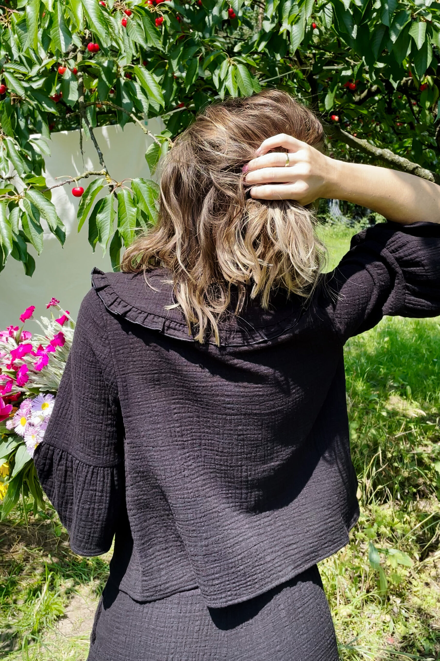 Modelka na zdjęciu ma 173cm i standardowo nosi rozmiar S, na zdjęciu prezentuje bluzkę Rosalie w rozmiarze S.