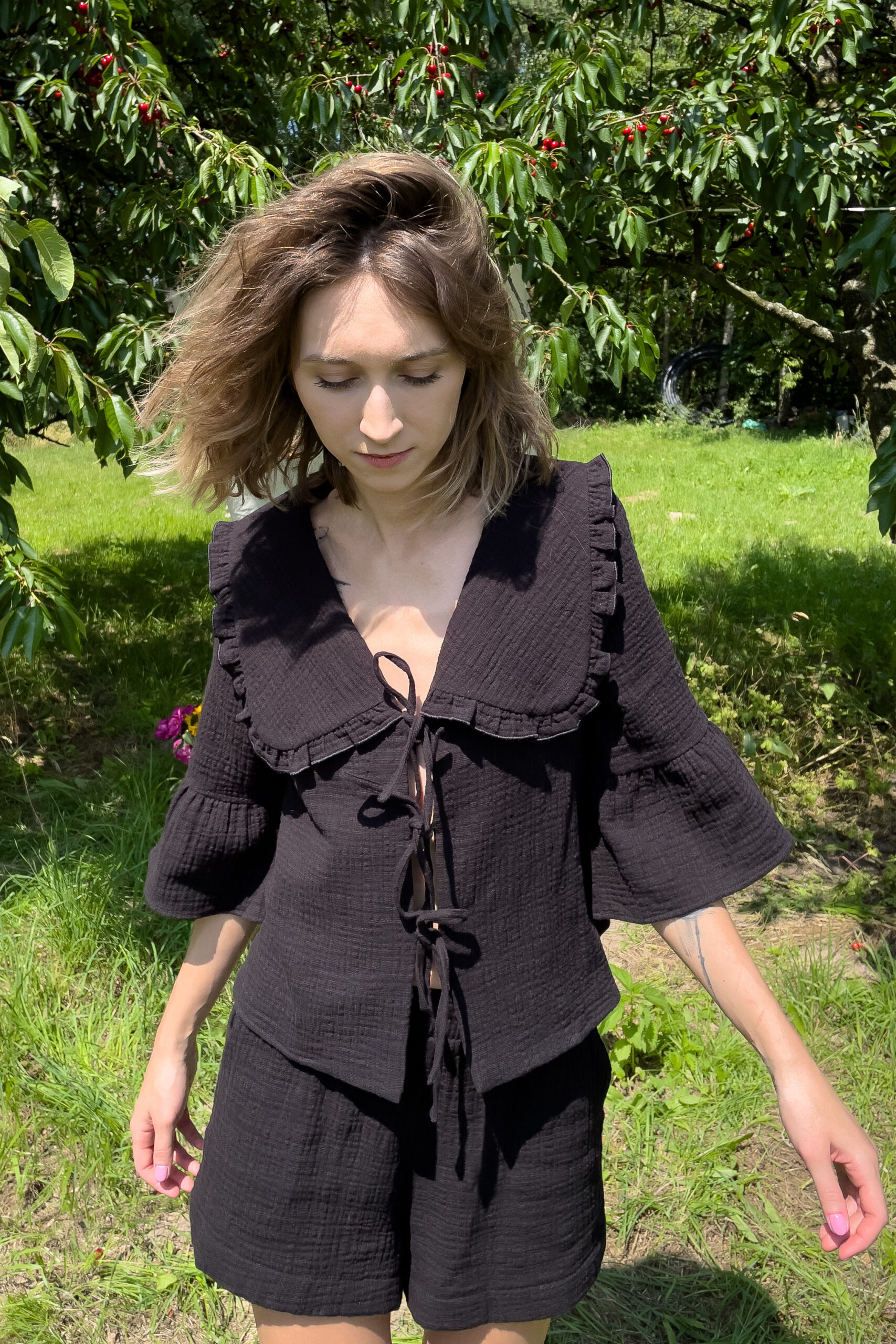 Bluzka wyróżnia się dużym kołnierzem zakończonym delikatną falbanką, który dodaje całości romantycznego uroku.