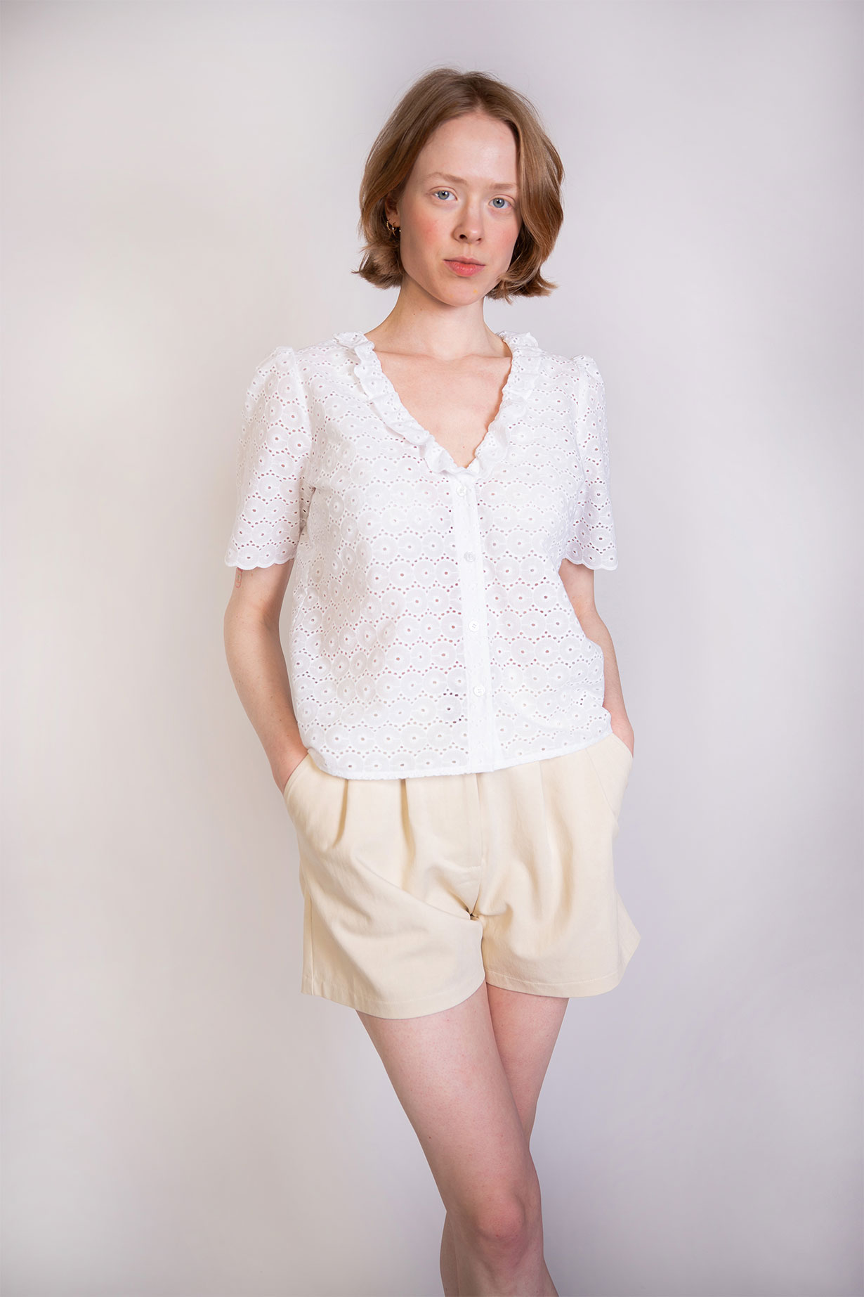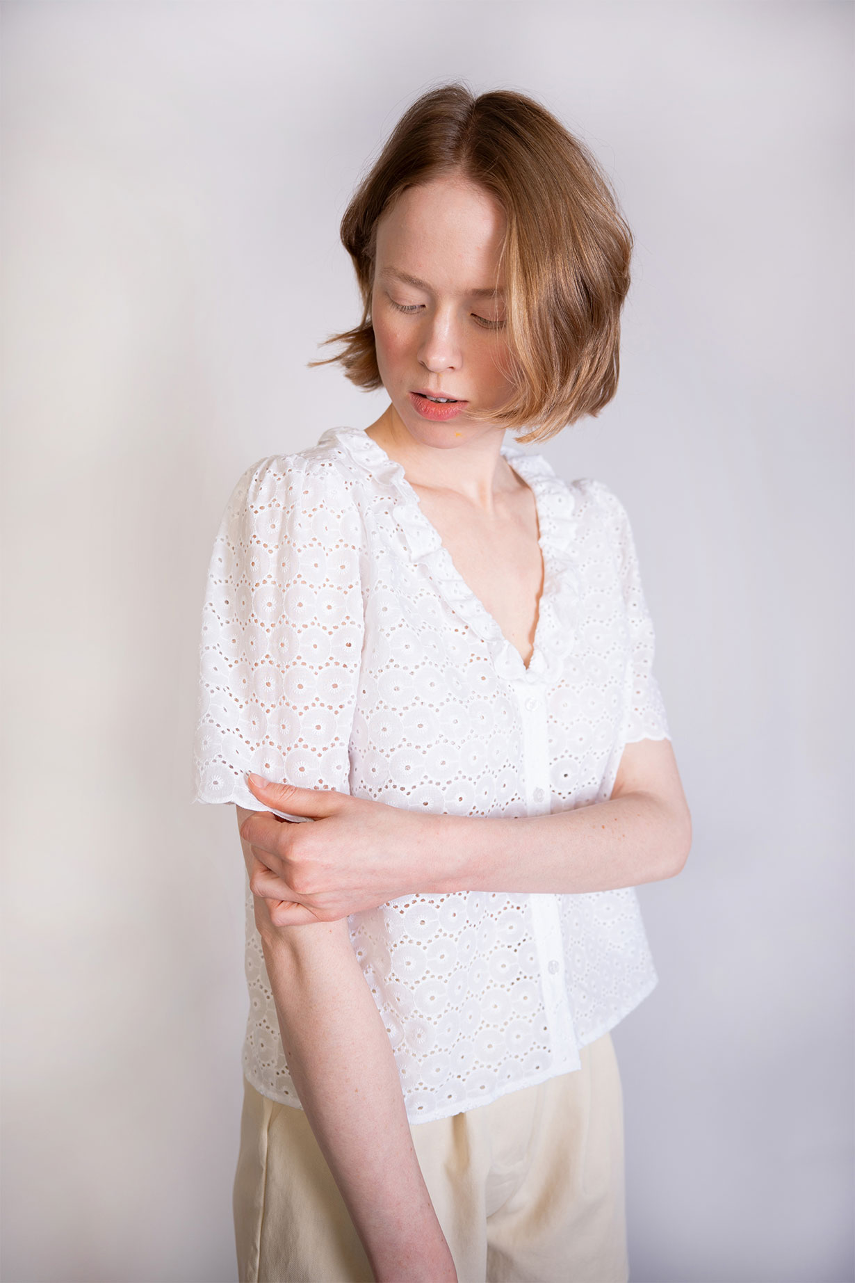 Długość? Taka akurat – nie za krótka, nie za długa. Spokojnie wsuniesz ją w spodnie i zostanie tam, gdzie trzeba. Materiał ma delikatnie ażurową strukturę, dzięki czemu koszula jest przewiewna i idealna na ciepłe dni. Dekolt i rękawy wykończone pięknym haftem, a na rękawach delikatne bufki. Nic tu nie jest przypadkowe.