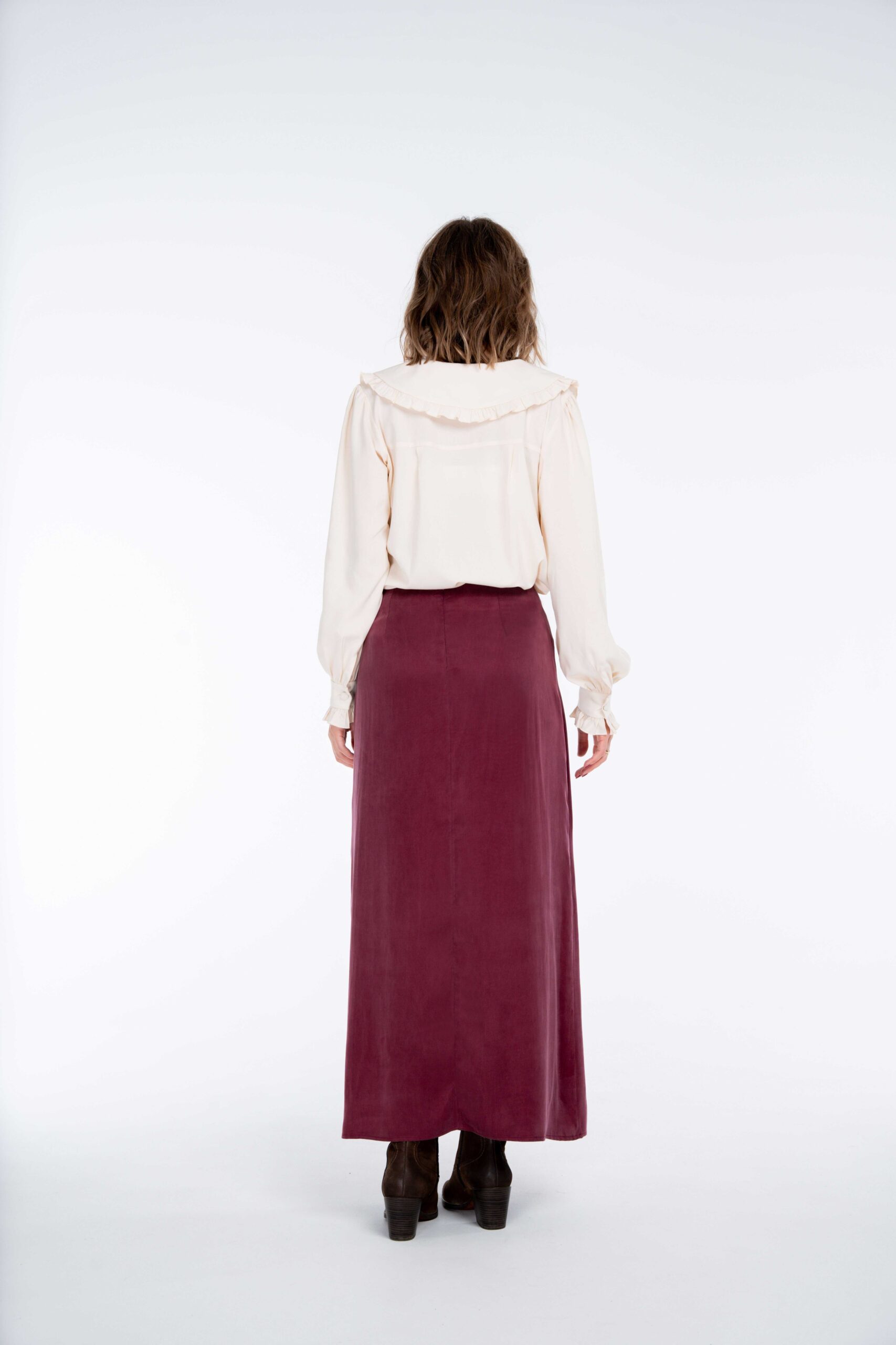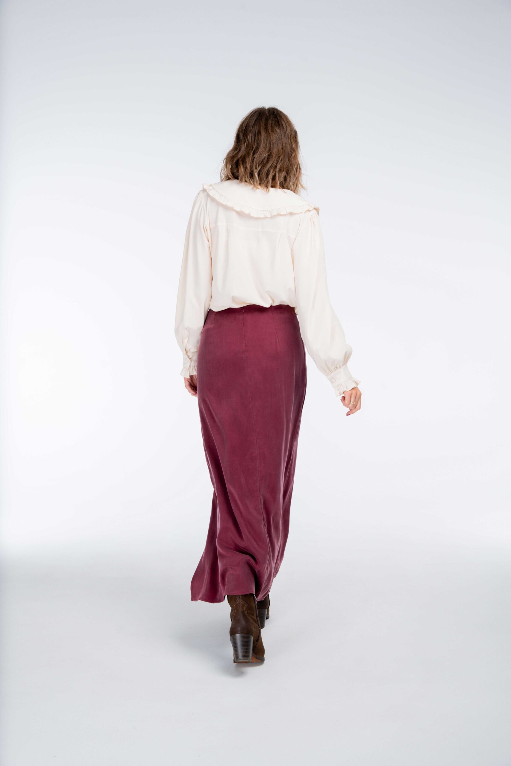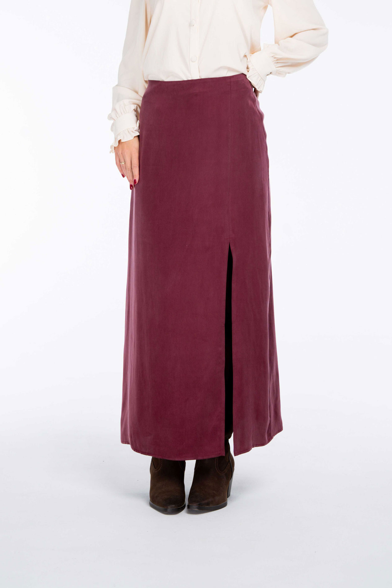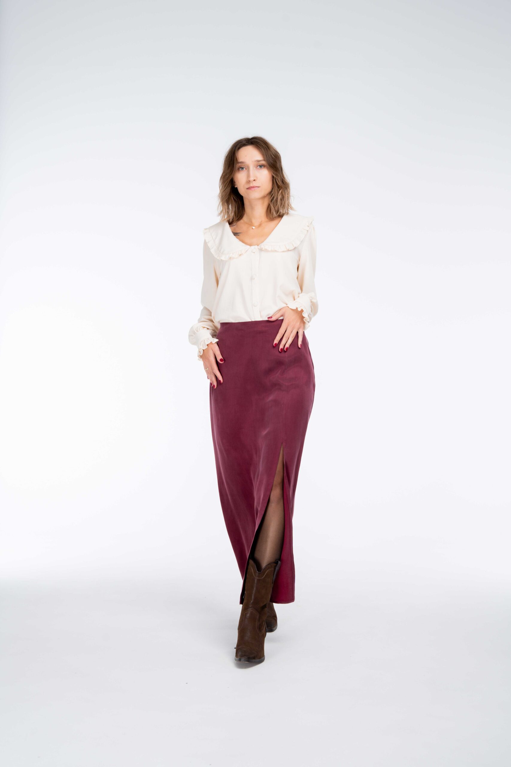 Długa spódnica o prostym kroju to idealna propozycja dla kobiet ceniących elegancję i komfort. Wykonana z wysokiej jakości mieszanki cupro i wiskozy, subtelnie połyskuje i pięknie układa się w ruchu, dodając stylizacji lekkości. Rozcięcie na nodze zapewnia swobodę oraz dodaje zmysłowego charakteru, a kryty zamek z tyłu sprawia, że całość wygląda wyjątkowo schludnie i estetycznie. To doskonały wybór zarówno na co dzień, jak i na specjalne okazje.