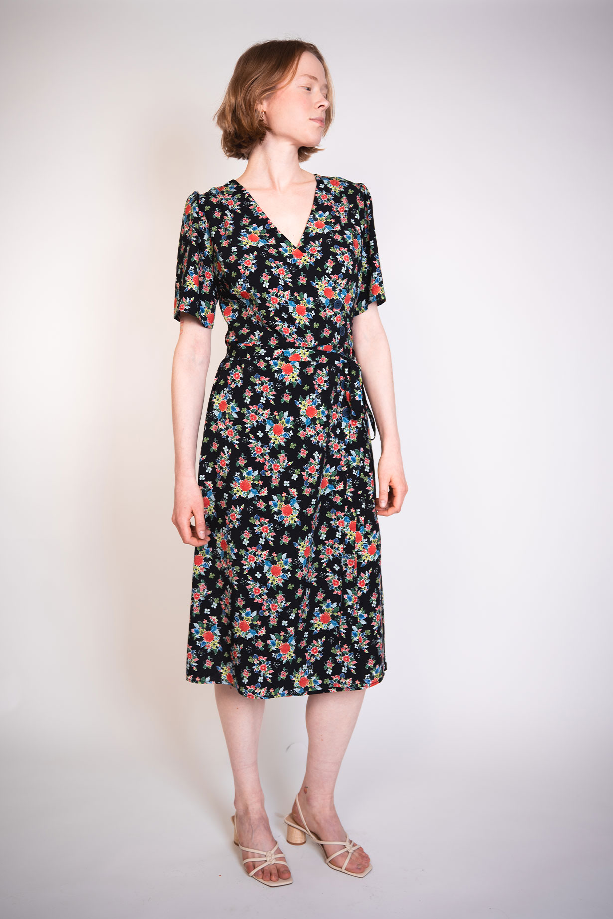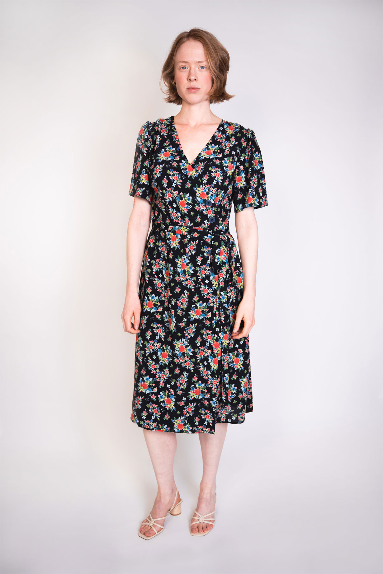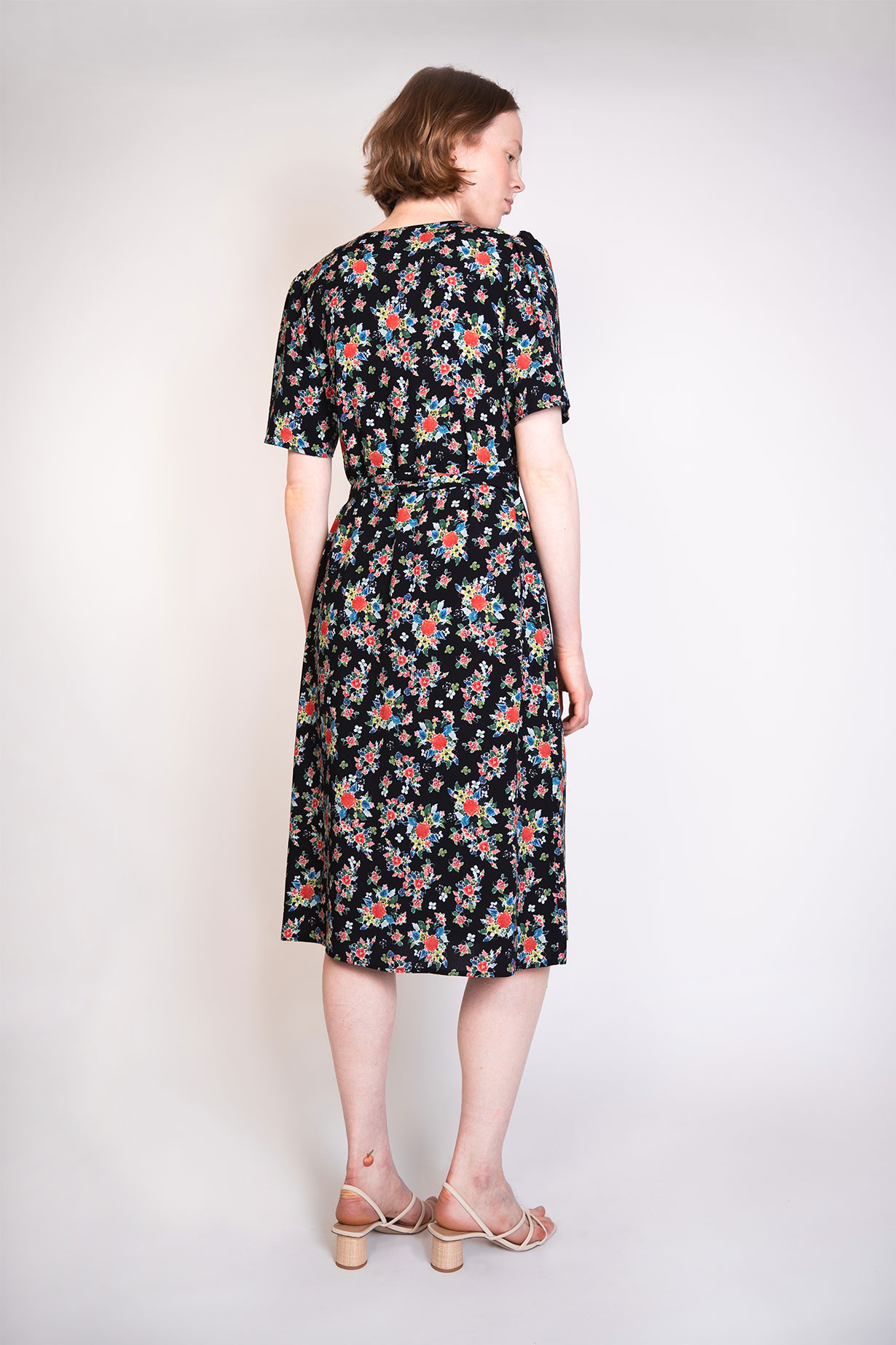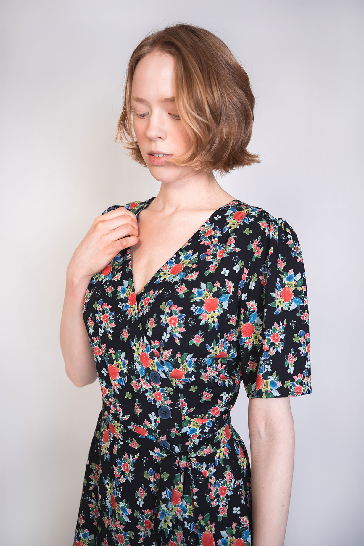 Helena ma klasyczny kopertowy krój, ale nic się nie przesuwa – sprytnie wszyte guziczki trzymają wszystko na swoim miejscu. Z tyłu kryje się elastyczna guma, więc jak już zawiążesz pasek, podkreślisz talię i usiądziesz, to możesz nadal oddychać. A nawet zjeść niedzielny obiad z dokładką.